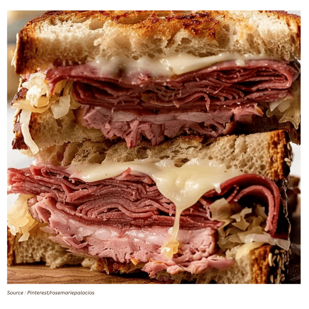 Three sharp cheeses: Cooper Sharp cheese, sharp cheddar, and fontina are layered to create a bold, melty filling. The sharpness is meant to stand up to the pastrami’s cured, peppery profile.