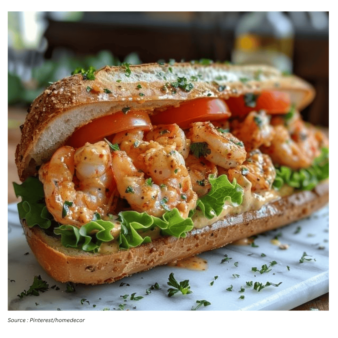 What stays consistent is the balance: crisp fried shrimp, a creamy and seasoned remoulade, and fresh toppings inside butter-toasted French bread. It’s a sandwich designed to feel both comforting and lively, with enough crunch, spice, and acidity to keep each bite interesting.