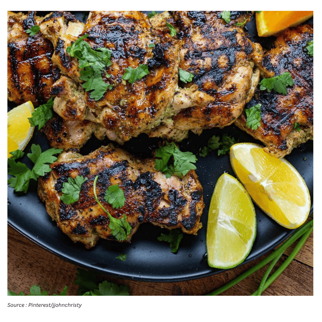 Mojo marinade brings the personality, but the chicken itself sets you up for success. This approach uses a mix of bone-in, skin-on chicken breasts and thighs. Because breasts are typically larger, the breasts are halved so they’re closer in size to the thighs. That small piece of prep is less about presentation and more about control: when the pieces are similar in size, they cook more evenly, reducing the risk that some pieces dry out while others lag behind.